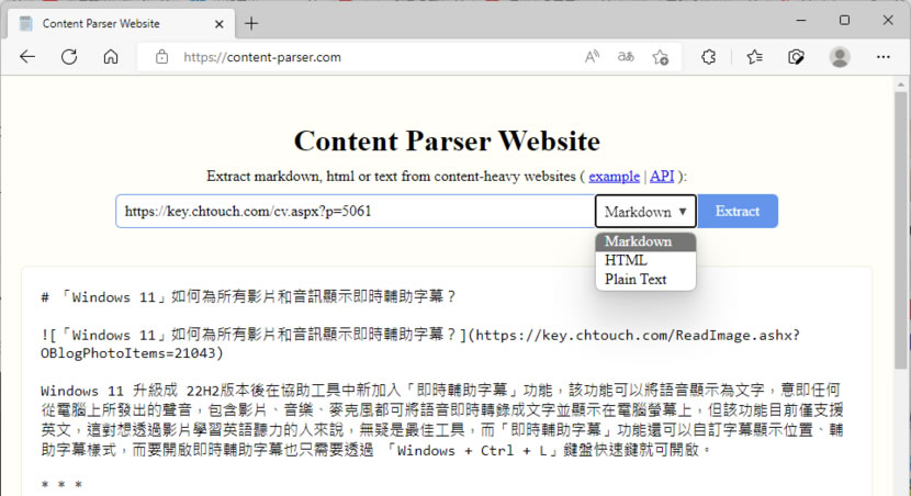 首頁線上工具生產力工具 Content Parser Website 解析並提取網頁內的 Markdown、Html 或 Text 網頁內包含 HTML、JavaScript 及主要內容還有就是用來排版的 CSS語法,因此當檢視網頁原始碼的時候這些全部都會出現,而 Content Parser Website 這個網站可將網頁解析、篩選過雜結構並單純提取成 Markdown 標記式語言、Html 語法或是 Text,使用方式很簡單,僅需輸入網址選擇要提取的格式,就可以在線上預覽提取後的各種格式,方便使用者做後續的應用。 🔔 不錯過任何精彩! 立即訂閱我們的 LINE 官方帳號 每次發佈新文章時,您將會第一時間收到本站文章連結通知,輕鬆掌握最新資訊! 使用 LINE 追蹤文章更新 §相關文章,還可以參閱:Google AI Plus 降到 260 元對決 ChatGPT Go!誰的功能更值得訂閱?ChatGPT Go 月付 290 元值得嗎?免費版、Plus 完整比較用 AI 做出的電影,YouTube 就看得到!一起來欣賞這部贏得百萬美元的突尼西亞短片《Lily》Apple Creator Studio 來了:Final Cut Pro、Logic Pro 等九款 App 月付 390 元,學生優惠僅 90 元ChatGPT 智慧購物功能登台!台灣用戶也能用 AI 做商品研究與比價 如何使用 Content Parser Website 篩選網頁結構? 1.使用瀏覽器進入 Content Parser Website 網站,輸入要解析並提取的網址。 2.網頁解析成 Markdown。 3.提取成 HTML。 4.最後式純文字。 Content Parser Website網站網址:https://content-parser.com/