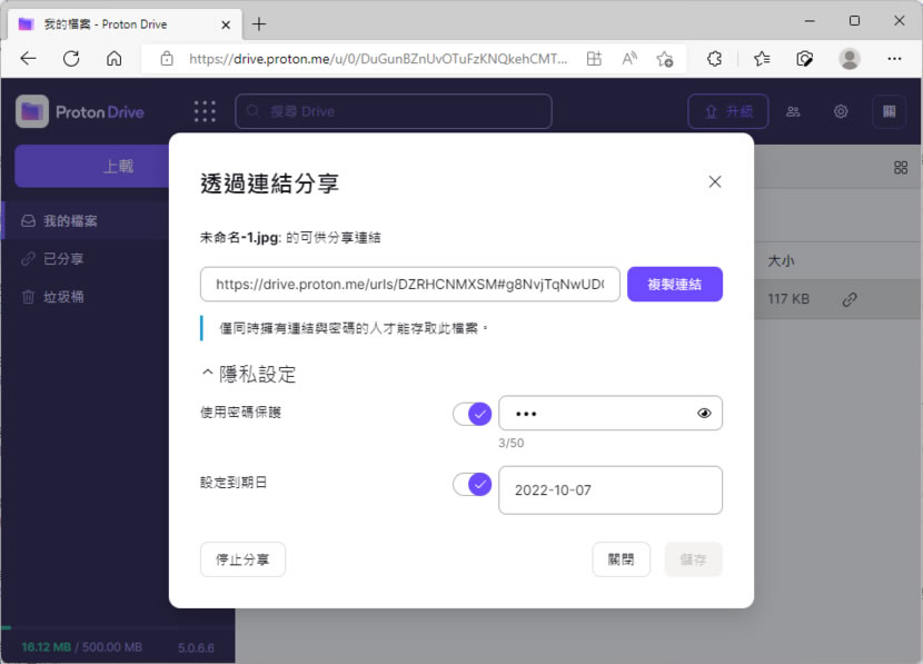 首頁線上工具雲端儲存 Proton Drive 可設定檔案分享密碼或到期日的免費雲端硬碟 以注重個人隱私及檔案安全起家的 Proton 網路服務,除了有 Mail 服務外,還有 VPN、Calendar 行事曆及Proton Drive 網路硬碟等產品,而且一個帳號就能使用所有相關服務,例如之前有申請 Proton Mail 就可以獲得 500 MB 的免費雲端硬碟空間,而在該雲端硬碟空間分享檔案也與 OneDrive 及 Google Drive 不同,其可以設定檔案分享密碼或是設定檔案分享到期日,大幅降低檔案分享管理工作量又提升檔案安全性。 🔔 不錯過任何精彩! 立即訂閱我們的 LINE 官方帳號 每次發佈新文章時,您將會第一時間收到本站文章連結通知,輕鬆掌握最新資訊! 使用 LINE 追蹤文章更新 §相關文章,還可以參閱:「免費圖片空間」Freeimage.host 讓您輕鬆上傳圖片並獲得分享連結LinkPicture 免費圖床上傳產生 URL 外連網址 圖片可直接檢視或內嵌到網頁imghut 免費圖片分享空間 可直接嵌入網頁使用Archive Forever 輸入網址就可以將網頁或網頁截圖永久儲存在區塊鏈上ZoomHub 線上免費圖片分享空間 可內嵌到其它網頁 如何使用 Proton Drive 分享檔案? 1.如果之前已有 Proton Mail 帳號就可以按[ Sign in ]按鈕來登入,如果沒有可按[ Create a free account ]按鈕註冊,一個帳號就能使用所有相關服務。 2.滑鼠右鍵點擊要分享檔案,再選擇[ 管理連結 ]。 3.選擇保護檔案的方式,也可兩個都設定。 4.取得該連結者,若要下載該檔案就需要有密碼。 Proton Drive網站網址:https://drive.proton.me/