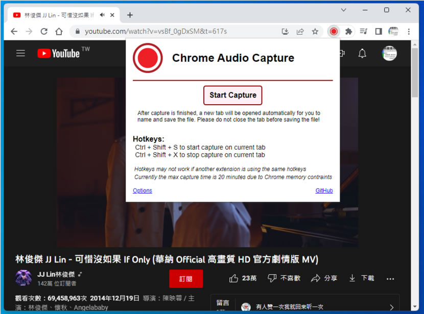 首頁瀏覽器擴充功能影音視聽 Chrome Audio Capture 輕鬆錄製網頁發出的聲音成 MP3 Chrome Audio Capture 是一個可在 Edge 及 Chrome 運作的瀏覽器擴充功能,其主要功能就是可擷取網頁所發出的聲音成 MP3檔案,例如,在 YouTube、TikTok、FaceBook 看影片、聽音樂只要是在網頁出現的聲音,都可以使用 Chrome Audio Capture 來錄製最常 20分鐘的 MP3檔案,操作相當簡單,完成安裝後,只要再發出聲音的網頁啟用 Chrome Audio Capture 就可進行錄製。 🔔 不錯過任何精彩! 立即訂閱我們的 LINE 官方帳號 每次發佈新文章時,您將會第一時間收到本站文章連結通知,輕鬆掌握最新資訊! 使用 LINE 追蹤文章更新 §相關文章,還可以參閱:Chrome Piano 擴充功能:讓瀏覽器秒變鋼琴,內建樂譜即點即彈AHA Music:輕鬆辨識瀏覽器當前分頁所播放的歌曲,並提供播放連結FastStream Video Player 加速串流影片下載速度,還可下載整部影片Youtube Shorts Autoplay 讓 YouTube 短影片可以自動播放的瀏覽器擴充功能Shazam 識別並找出瀏覽器內所發出聲音來自哪首歌曲 如何使用 Chrome Audio Capture 瀏覽器擴充功能錄製網頁聲音成 MP3? 1.Edge 及 Chrome 均可在 chrome 線上應用程式商店內安裝,按[ 加到Chrome ]按鈕,按其指引安裝。 2.在發出聲音的網頁,按 Chrome Audio Capture 按鈕,再按[ Start Capture ]按鈕。 3.開始錄製後,該分頁標題就會出現一個藍色標籤標示,並開始 20分鐘的倒數。 4.錄製完成可按[ Save Capture ]按鈕並下載。 Chrome Audio Capture語言:英文性質:免費官方網站:https://chrome.google.com/webstore/detail/chrome-audio-capture/kfokdmfpdnokpmpbjhjbcabgligoelgp/related