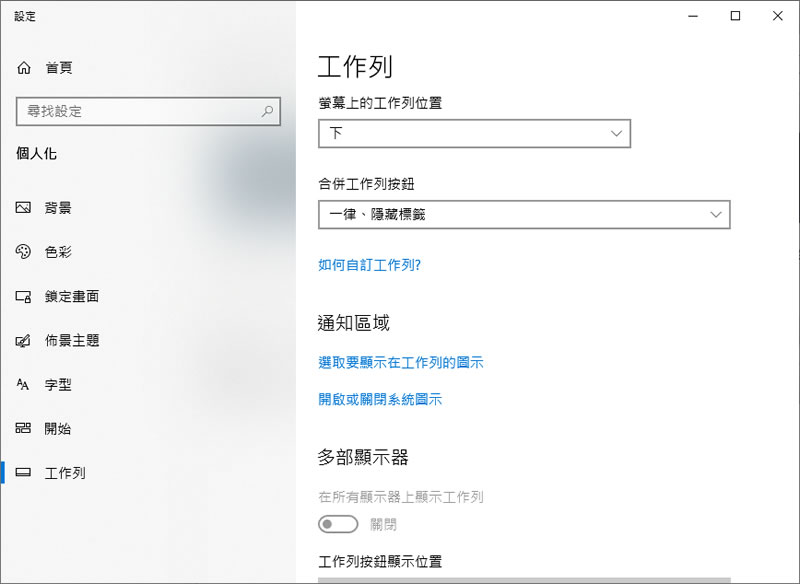 2.接下來就會出現工作列的設定視窗。若要將工作列縮小,可勾選[使用小圖示];若要調整工作列的顯示位置,可在螢幕上的工作列位置,使用下拉框來選擇上下左右來調整,調整好之後,點擊[確定]。