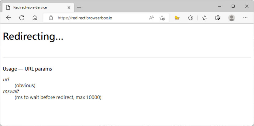 首頁線上工具網頁瀏覽 Redirect-as-a-Service 可自訂等待時間再重新導向至指定網址的免費服務 網站如果因改變網域、網址或需要將過時內容重新導向新網址,如果是自己會寫程式,那麼應該很容易就可以建立出能重新導向的頁面,如果使用率不高或懶得寫,我們可以來使用這個現成的且免費的 Redirect-as-a-Service 服務,該服務提供個人及企業建立 HTTP 重新定向請求的功能,透過該網站,我們可以建立具有等待時間的 URL 重定向請求,然後應用在自己的網站或應用程式並根據您的要求在您的網站或應用程序的任何位置使用它。 🔔 不錯過任何精彩! 立即訂閱我們的 LINE 官方帳號 每次發佈新文章時,您將會第一時間收到本站文章連結通知,輕鬆掌握最新資訊! 使用 LINE 追蹤文章更新 §相關文章,還可以參閱:Chrome 推出 Auto Browse:讓 AI 自動訂機票、找房子、填表單,還能即時改圖Google 搜尋『67』會發生什麼事?網友實測驚呼:螢幕活了!Google 2025 台灣年度搜尋榜:地震、普發現金、Gemini,我們都在找什麼?ChatGPT Atlas 瀏覽器問世:三大 AI 功能顛覆你的上網方式Microsoft Rewards 點數全自動狂賺法,一鍵設定、天天進帳! 如何使用 Redirect-as-a-Service 重新導向指定網址免費服務? 1.進入 Redirect-as-a-Service 網站就會看到使用方法。 2.舉個例子說明,下列網址會在 browserbox.io 等待 5秒後,重新轉向到 https://chtouch.com/ 網站。 https://redirect.browserbox.io/?url=https://chtouch.com/&mswait=5000 3.從以上範例我們可以看出其具體的格式如下, 我們可以自訂要導向去的網址,而等待時間則是以毫秒計算,1000 = 1秒。 https://redirect.browserbox.io/?url=要導向去的網址&mswait=等待時間 4.等待 1.5秒重新導向到範例。 免費追劇去 Redirect-as-a-Service網站網址:https://redirect.browserbox.io/