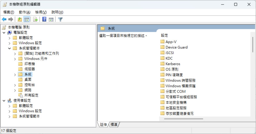 2.開啟「本機群組原則編輯器」在視窗的左側的本機電腦原則內依序點擊[ 設定 ] > [ 系統管理範本 ] > [ 系統 ]。