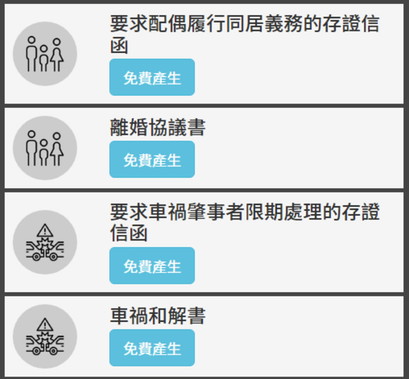 首頁線上工具生活資訊 LEGAL go 免費車禍和解書、借貸契約、勞動契約...等法律文件產生器 借貸時要用到的借貸契約、車禍事故要用到的車禍和解書或是夫妻雙方要離婚的協議書...等等,若無事實發生,一般人應該很難特別去了解這些具有法律效力文件的內容應該怎麼寫,為避免日後雙方權益有爭議,慎重點可以去請教律師,或是自行到網路上搜尋相關範本來填寫,藉此保障自己的權益。LEGAL go 這個「法律文件產生器」網站提供「要求配偶履行同居義務的存證信函」、「離婚協議書」、「要求車禍肇事者限期處理的存證信函」、「車禍和解書」、「借款契約書(借據)」及「網站(/APP)隱私權條款」法律文件,使用者只需要輸入個人資料、相關敘述...等相關條件,就能輕鬆產生一份符合自己實際情況的法律文件。其實,若需要法律諮詢扶助時,各縣市政府或有些民意代表都有提供免費服務,可透過網路搜尋來取得相關資源。 🔔 不錯過任何精彩! 立即訂閱我們的 LINE 官方帳號 每次發佈新文章時,您將會第一時間收到本站文章連結通知,輕鬆掌握最新資訊! 使用 LINE 追蹤文章更新 §相關文章,還可以參閱:Apple Music 台灣新用戶優惠:6個月免費暢聽,領取方式與限制一次看!2026春節追劇清單!Netflix 2月必看攻略:燒腦推理、火爆動作片,陪你從初一爽追到開工!459 萬人搶 60 萬份!運動幣中獎號碼公布,快查你的身分證尾數都馬一起GO!LINE GO新年優惠最高拿$800優惠券,還有一個月乘車金等你抽過年搭高鐵自由座要排多久?看LINE就知道 台灣高鐵×LINE TODAY推出春節限定燈號預估服務 如何使用 LEGAL go 快速產生法律文件? 1.進入 LEGAL go 網站,就可以看到 LEGAL go 網站所提供的「要求配偶履行同居義務的存證信函」、「離婚協議書」、「要求車禍肇事者限期處理的存證信函」、「車禍和解書」、「借款契約書(借據)」及「網站(/APP)隱私權條款」法律文件。 2.以「車禍和解書」為例,按下[ 開始 ]按鈕,就會有步驟地帶使用者一步步的填寫相關資料。 3.依格式要求填寫相關內容。 4.最後,我們便可以取得一個 Word 檔案,以利我們後續修改相關內容。 LEGAL go網站網址:https://legal-go.herokuapp.com/