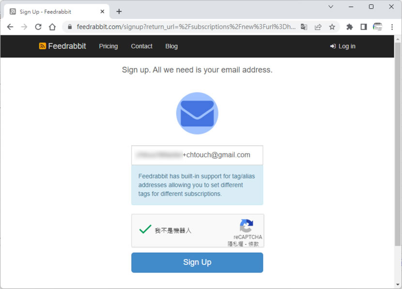 2.知道以上 GMail 分身的組合方式後,我們可以任選其中一種方式來使用,例如要利用電子郵件訂閱關鍵應用的最新文章,我們可以到 Feedrabbit(操作步驟) 網站,輸入電子郵件分身,例如:key20221117+chtouch@gmail.com,按下[ Sign up to Subcribe ]按鈕。