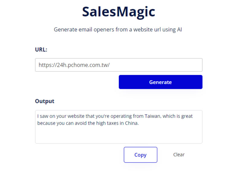 首頁線上工具生產力工具 SalesMagic 用 AI 產生具吸引力的網站介紹詞 電子商務常會使用電子郵件行銷,而網站介紹就成為重中之重,如何寫出足夠吸引目標人群開啟產品網址的介紹,應該是很多經營電商者努力的目標,至於如何寫出具吸引力的網址介紹,我們可以借助 SalesMagic 這個網站所提供的免費服務。SalesMagic 網站的使用方法很簡單,只需先使用電子郵件完成註冊,接下來就可以使用 SalesMagic 所提供的服務,而其產生網址介紹的操作也很簡單,使用者僅需輸入網址,剩下的就交由 SalesMagic AI 產生該網址介紹,雖是英文服務,但透過翻譯工具,自己再稍微修飾後便可以應用。 🔔 不錯過任何精彩! 立即訂閱我們的 LINE 官方帳號 每次發佈新文章時,您將會第一時間收到本站文章連結通知,輕鬆掌握最新資訊! 使用 LINE 追蹤文章更新 §相關文章,還可以參閱:OpenAI 在 ChatGPT 中測試廣告|哪些帳戶受影響、廣告運作原則一次看在蝦皮當賣家,商品如何定價?手續費、免運、稅金怎麼算?蝦皮手續費計算機幫你全搞定!Google AI Plus 降到 260 元對決 ChatGPT Go!誰的功能更值得訂閱?ChatGPT Go 月付 290 元值得嗎?免費版、Plus 完整比較用 AI 做出的電影,YouTube 就看得到!一起來欣賞這部贏得百萬美元的突尼西亞短片《Lily》 如何使用 SalesMagic 產生網站介紹? 1.要使用 SalesMagic 網站所提供的服務,需要先註冊,如果覺得想先試試,也可以使用 臨時電子郵件信箱 來試用。 2.完成註冊,就可以輸入網址產生介紹詞。 3.pchome 所產生的介紹詞。 SalesMagic網站網址:https://salesmagic.ai/