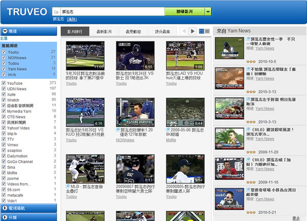 首頁線上工具網頁瀏覽 truveo.com 實用的影音搜尋引擎 由於 YouTube 影音網站的成功,相繼的做這類型的網站也越來越多,這也代表了想要找尋一段影片的搜尋者,需要一個個進入影音網站進行搜尋,因此相關的搜尋應用也隨之產生, truveo.com 是由 AOL 製作的影音搜尋引擎,可同步搜尋多達百個的影音網站及電視頻道進行搜尋,若常在網路欣賞影片的朋友,可以試試 truveo.com。 🔔 不錯過任何精彩! 立即訂閱我們的 LINE 官方帳號 每次發佈新文章時,您將會第一時間收到本站文章連結通知,輕鬆掌握最新資訊! 使用 LINE 追蹤文章更新 §相關文章,還可以參閱:Chrome 推出 Auto Browse:讓 AI 自動訂機票、找房子、填表單,還能即時改圖Google 搜尋『67』會發生什麼事?網友實測驚呼:螢幕活了!Google 2025 台灣年度搜尋榜:地震、普發現金、Gemini,我們都在找什麼?ChatGPT Atlas 瀏覽器問世:三大 AI 功能顛覆你的上網方式Microsoft Rewards 點數全自動狂賺法,一鍵設定、天天進帳! 如何使用 truveo.com 所提供的搜尋服務? 1.進入 truveo.com 網站後,在其搜尋框內輸入關鍵字,點擊[搜尋影片]即可。 2.接下來,就會列出各個網站的搜尋結果,若想針對喜愛的影音網站進行搜尋,可在左列的頻道處,勾選喜愛的影音網站。 3.若要播放,點擊所要欣賞的影片,即進入該網站的影音播放。 truveo.com網站網址:http://tw.truveo.com/