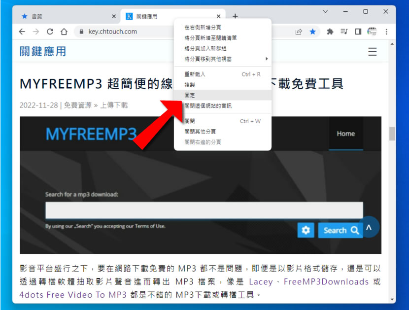 2.完成更新重開瀏覽器後,滑鼠右鍵點擊要固定的分頁就會出現功能表,再選擇[ 固定 ]。