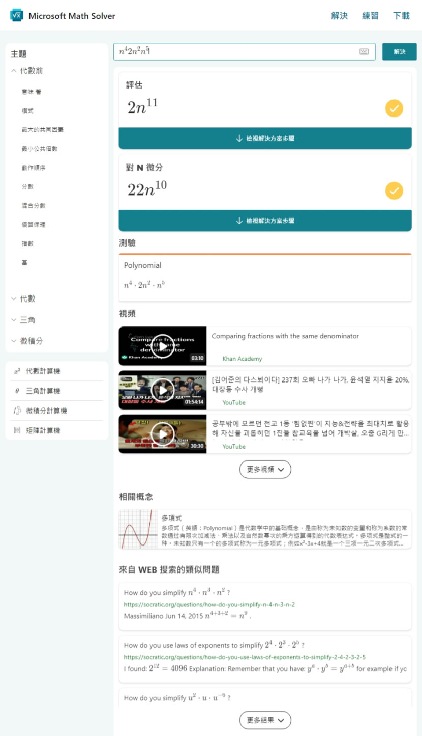 Microsoft Math Solver 網站,提供代數基礎(Pre-Algebra)、代數、三角函數及微積分等數學主題的解題方法,還提供代數計算機、三角函數計算機、微積分計算機、矩陣計算機等功能,使用者可以利用網站所提供的數學符號輸入板,輕鬆輸入數學符號,快速得到數學答案,當然,若只有答案便無助學習,Math Solver 還提供解題步驟及後續相關練習題,讓求解與練習合在一起,真正搞懂求解過程。