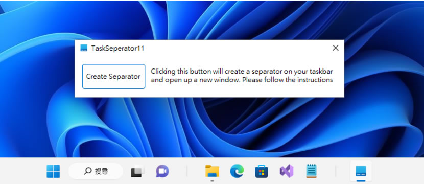 首頁電腦軟體視窗桌面 TaskSeparator11 可在工作列圖示之間加入分隔線的免費應用程式 Windows 系統允許使用者將經常會用到的檔案、資料夾或是應用程式釘選到工作列,即便開啟不是釘選在工作列上的檔案或應用程式,也會自動添加到工作列,讓使用者方便存取,如果想將上述兩者分開,我們可以來使用 TaskSeparator11 這套可在工作列產生分隔線的免費應用程式,TaskSeparator11 的使用方式很簡單,每次開啟可產生一條分隔線,將分隔線釘選並使用滑鼠拖曳到想要的位置即可,即便是日後想刪除該分隔線,也只要取消釘選即可。 🔔 不錯過任何精彩! 立即訂閱我們的 LINE 官方帳號 每次發佈新文章時,您將會第一時間收到本站文章連結通知,輕鬆掌握最新資訊! 使用 LINE 追蹤文章更新 §相關文章,還可以參閱:Windows 官方桌布商店來了!超過 400 款風格包,從遊戲到國家公園通通有微軟 City Art Search 自動將 10400多幅世界名畫設置成 Windows 鎖定螢幕畫面Digital Clock 4 可靈活自訂的桌面時鐘,支援報時、計時器、鬧鐘等多款附加套件TrafficMonitor 在 Windows 桌面上顯示網路上傳與下載的即時網速「免費下載」故宮博物院 2023 兔年月曆桌布 如何使用 TaskSeparator11 應用程式在 Windows 11 工作列上產生分隔線? 1.解壓縮所下載的檔案後,執行 setup.exe 進行安裝,開啟 TaskSeparator11 應用程式後。 2.按[ Create Separator ]按鈕就會產生一條分隔線在工作列,要幾條分隔線就做幾次。 3.接下來,根據提示將該分隔線釘選到工作列並使用滑鼠拖曳到想放的位置就完成。 4.若日後不想用,也只要取消釘選即可。 TaskSeparator11版本:1.0.1語言:英文性質:免費官方網站:https://github.com/DrummerSi/TaskSeparator11下載:按我前往官方網站下載