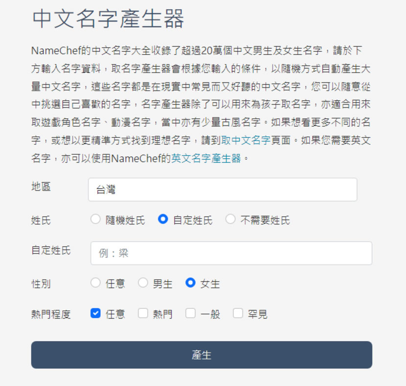 首頁線上工具生活資訊 NameChef 線上中、英文名字產生器 範例、程式測試需要用到中文名字,如果都是用一些張三、李四、王二...等,總讓人覺得不夠正式,且一看資料就是假的,那麼,哪裡可以取得大量的中文名字供自己測試或做範例用呢?除了,先前介紹過的RichyLi.com 中文姓名產生器外,NameChef 這個網站亦提供大量的中文名字可供利用。NameChef 網站所提供的「中文名字產生器」完全免費,可根據不同地區,自訂或隨機姓氏、性別、熱門程度等條件來篩選全站 20萬個中文男生及女生名字,NameChef 除了提供中文姓名外,亦提供英文名字產生器,甚至可以輸入中文姓名依諧音來取英文名,讓名字更貼近現實。 🔔 不錯過任何精彩! 立即訂閱我們的 LINE 官方帳號 每次發佈新文章時,您將會第一時間收到本站文章連結通知,輕鬆掌握最新資訊! 使用 LINE 追蹤文章更新 §相關文章,還可以參閱:Apple Music 台灣新用戶優惠:6個月免費暢聽,領取方式與限制一次看!2026春節追劇清單!Netflix 2月必看攻略:燒腦推理、火爆動作片,陪你從初一爽追到開工!459 萬人搶 60 萬份!運動幣中獎號碼公布,快查你的身分證尾數都馬一起GO!LINE GO新年優惠最高拿$800優惠券,還有一個月乘車金等你抽過年搭高鐵自由座要排多久?看LINE就知道 台灣高鐵×LINE TODAY推出春節限定燈號預估服務 如何使用 NameChef 產生中文名字? 1.使用瀏覽器進入 NameChef 網站,進入中文姓名產生器。 2.可依照條件篩選名字。 3.產生出的名字,可透過名字旁的複製按鈕,複製到剪貼簿中來使用。 4.不僅有中文名字,還有英文名字。 ※NameChef 網站,除了名字產生器外,在名字靈感處還有取名的功能,可多加利用。 NameChef網站網址:https://www.namechef.co/zh/name-generator/chinese/