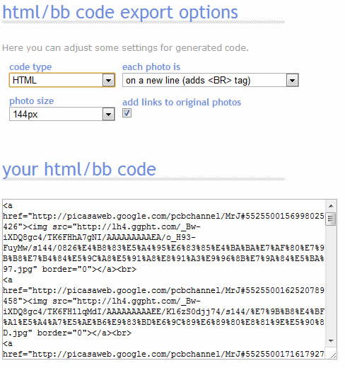 首頁線上工具網頁瀏覽 picasa2html.com 批次取出 Picasa 網路相簿中照片的 HTML 及 BB Code 外連語法 若常在網路上分享圖片給朋友,應該都會相當喜歡 Google Picasa 所內建的網路相簿功能,因為只要有 Google 帳號,就可以有 1GB 免費空間來使用且 Google Picasa 網路相簿功能還供圖片的外連網址,因此當自己有部落格或網站的朋友,通常會搭配 Google Picasa 軟體來管理圖片,將其變成自己圖片的外連「圖床」,以便節省網路流量,但方便歸方便,若想要抓取圖片的網址時,也是必須一張一張慢慢去複製圖片的網址,因為 Google Picasa 網路相簿的相片網址並無規則可依循,有點給它麻煩。picasa2html.com 是一個能將 Google Picasa 相簿的相片網址,整個列出來的免費網路服務,後續只要使用續傳軟體之類的程式,就能批次下載全部的圖片,也可以產生全部圖片的 HTML 碼、BB 碼,方便直接貼到網頁、論壇或部落格中。相類似的網站服務可參閱 PicasaWebUtility 線上產生Google Picasa網路相簿內所有相片URL連結網址及下載 。 🔔 不錯過任何精彩! 立即訂閱我們的 LINE 官方帳號 每次發佈新文章時,您將會第一時間收到本站文章連結通知,輕鬆掌握最新資訊! 使用 LINE 追蹤文章更新 §相關文章,還可以參閱:Chrome 推出 Auto Browse:讓 AI 自動訂機票、找房子、填表單,還能即時改圖Google 搜尋『67』會發生什麼事?網友實測驚呼:螢幕活了!Google 2025 台灣年度搜尋榜:地震、普發現金、Gemini,我們都在找什麼?ChatGPT Atlas 瀏覽器問世:三大 AI 功能顛覆你的上網方式Microsoft Rewards 點數全自動狂賺法,一鍵設定、天天進帳! 如何使用 picasa2html.com 所提供的服務? 1.進入 picasa2html.com 網站後,在 google/picasa username 處中輸入 Google 帳號後,點擊[Go]。 2.接下來開始擷取帳號內相簿,且不需要密碼,唯一一點就是該相簿在網路相簿中必須是設為公開,所擷取出的相簿會列在 albums list 處。從已擷取的相簿中,點擊要取出的相簿的外連語法,在 album photos 處,便可看到相簿內所有的相片,可利用其底下的 Select all (全部選取)| Select none (全部取消選取),或使用滑鼠搭配[Ctrl]來做部分選取。 3.選擇好相片後,便可產生外連語法。 code type:可選擇要輸出 HTML 或 BB Code 語法 photo size:可選擇縮圖的尺寸大小,有144px、288px、320px...等可供選擇 each photo is:可選擇 on a new line (adds <BR> tag) 一張照片一行;另外 at the same line 是橫向排列,不換行 add links to original photos:預設為勾選,點擊縮圖就會連結到原始照片尺寸的圖片。 picasa2html.com網站網址:http://www.picasa2html.com/