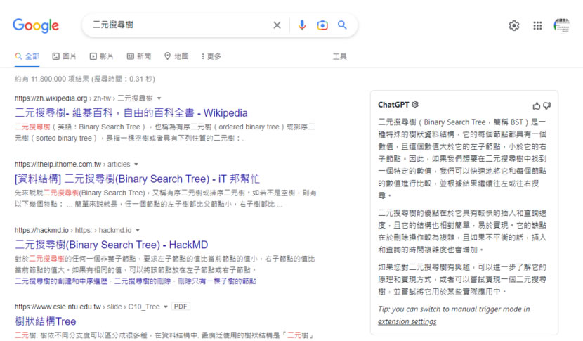首頁瀏覽器擴充功能生產力工具 ChatGPT for Google 使用 Google 搜尋時也讓 ChatGPT AI 機器人同步回應(瀏覽器擴充功能) 中、英文都通的ChatGPT AI聊天機器人雖然還處在公開測試階段,但已讓 Google 備感威脅,而在 ChatGPT 爆紅之後,像是匯出對答紀錄成文字檔及讓 ChatGPT 結合到 Google 或 Bing 搜尋中的瀏覽器擴充功能也陸續推出,進一步推升 ChatGPT 的實用性。ChatGPT for Google 是一個 Chrome 瀏覽器擴充功能,完成安裝後,當使用 Google 搜尋時,除了原 Google 的搜尋結果外,該擴充功能會將搜尋關鍵字一併傳給位在搜尋結果右側的 ChatGPT AI 機器人並自動回應,兩者之間最大差別在於 Google 搜尋後由使用者自行選擇要前往的網站,而 ChatGPT 會直接告訴使用者參考答案。ChatGPT AI 聊天機器人是否真能如預測取代 Google 搜尋,如果以現在給出的答案來看,某方面問題的回答確實乾淨俐落,雖不可盡信,但要全面取代 Google 搜尋還是需要時間,然現階段讓關鍵字搜尋與 ChatGPT結合,對使用者而言不失為更好方案,另外,以下的 ChatGPT 輔助工具,可以讓我們更好的應用 ChatGPT: 如何將 ChatGPT 網站安裝成應用程式在桌面執行? Save ChatGPT 將 ChatGPT 的對話紀錄匯出成文字檔(瀏覽器擴充功能) 「ChatGPT 指令大全」透過精煉的指令範本 發揮寫報告、程式及資料整理等強大功能 WebChatGPT 結合網路搜尋資料,讓 ChatGPT 整合資訊沒有時間限制(瀏覽器擴充功能) ChatGPT for Google 使用 Google 搜尋時也讓 ChatGPT AI 機器人同步回應(瀏覽器擴充功能) ChatGPT Prompt Genius 將 ChatGPT 對話內容完整的匯出成 PNG、PDF、MD 檔或分享網址(瀏覽器擴充功能) 🔔 不錯過任何精彩! 立即訂閱我們的 LINE 官方帳號 每次發佈新文章時,您將會第一時間收到本站文章連結通知,輕鬆掌握最新資訊! 使用 LINE 追蹤文章更新 §相關文章,還可以參閱:Bing Chat sidebar for Chrome 讓 Chrome 在側邊欄就能使用 Bing Chat(瀏覽器擴充功能)如何在 Chrome 瀏覽器也能使用全新的 Bing AI?「UseChatGPT.AI」快速編寫、改寫、總結、解釋或翻譯網站上的任何文章 (瀏覽器擴充功能)WebChatGPT 結合網路搜尋資料,讓 ChatGPT 整合資訊沒有時間限制(瀏覽器擴充功能)ChatGPT Prompt Genius 將 ChatGPT 對話內容完整的匯出成 PNG、PDF、MD 檔或分享網址(瀏覽器擴充功能) 如何使用 ChatGPT for Google 瀏覽器擴充功能? 1.使用 ChatGPT for Google 瀏覽器擴充功能,同樣需要有 ChatGPT 帳號,不僅 Chrome 瀏覽器可用,Microsoft Edge 瀏覽器同樣可到chrome 線上應用程式商店中安裝並在 Bing 搜尋中使用。 2.依照指示完成安裝後,便可以開始在 Bing 或 Google 搜尋中使用,例如,以二元搜尋樹為關鍵字搜尋,除了原本的 Google 搜尋結果外,還加入 ChatGPT 的回答。 3.英翻中的應用。 4.自傳範例。 5.數學解題。 6.ChatGPT for Google 瀏覽器擴充功能,可設定同步回答的觸發時機及介面樣式。 ChatGPT for Google語言:英文性質:免費官方網站:https://chrome.google.com/webstore/detail/chatgpt-for-google/jgjaeacdkonaoafenlfkkkmbaopkbilf/related
