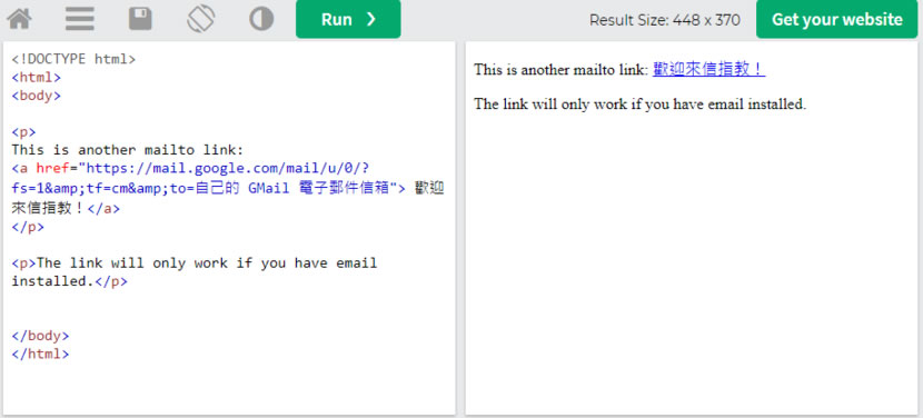3.而如今 Google 的 GMail 郵件服務已成大宗,傳統 mailto 寫法藉以開啟作業系統安裝的電子郵件軟體,顯然不符合目前主流,因此,我們可以將原 mailto 改成如下語法: