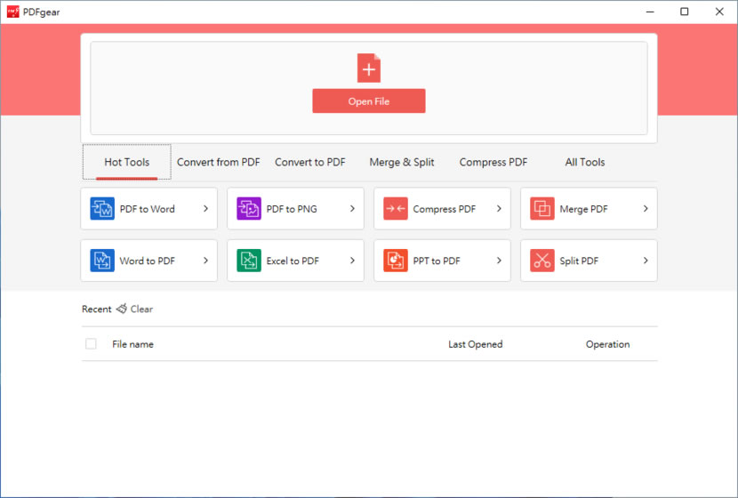 1.完成安裝開啟 PDFgear 應用軟體,主介面中主要以轉檔、壓縮、拆分與合併功能為主。