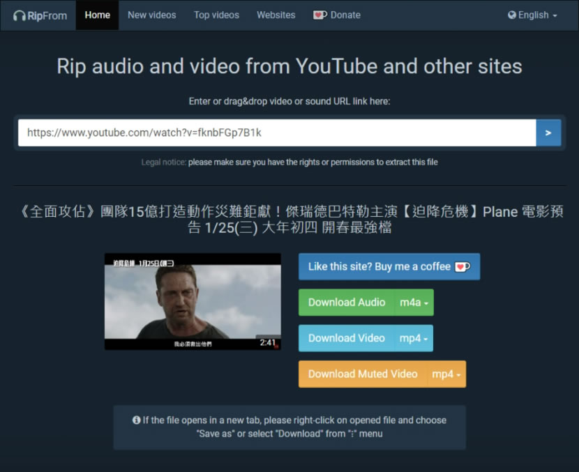 首頁線上工具上傳下載 RipFrom 下載 YouTube 影片 支援 FB、IG 和 TikTok 近千個網站且全程零廣告 RipFrom 是一個提供影片下載的免費網站,支援 YouTube、Facebook、Instagram、Twitter、Dailymotion、Vimeo、VK、TikTok、SoundCloud、Reddit...等近千個網站的影片下載,其使用方式很簡單,只要將影片網址輸入就可以選擇要下載的影、音檔案格式,而且操作過程零廣告,試過 n個,不如來試 RipFrom 這個網站。 🔔 不錯過任何精彩! 立即訂閱我們的 LINE 官方帳號 每次發佈新文章時,您將會第一時間收到本站文章連結通知,輕鬆掌握最新資訊! 使用 LINE 追蹤文章更新 §相關文章,還可以參閱:M3U8 Player:本地瀏覽器處理,播放、下載、轉 MP4 一站免費完成getM3U8 免費線上工具:輕鬆下載 M3U8 串流影片並轉檔 MP4SnapWC 免費影片下載器:一鍵搞定 YT、IG、FB、抖音等 10,000+ 平台影片、音訊、圖片需要分享圖片連結?試試 PiXhost 免費圖床服務P2PFileShare 線上 P2P 傳檔免費工具,免安裝無檔案大小限制直接瀏覽器傳輸 如何使用 RipFrom 下載 YouTube 影片? 1.進入 RipFrom 網站,可先到 Websites 查詢所支援的網站。 2.支援下載的網站是按字母排序。 3.以 YouTube 影片下載為例,將複製好的影片網址貼到輸入框內後,按[ Enter ]鍵盤鍵,就會開始分析並列出可下載的影、音檔案選項。 4.不論選何種檔案下載均可播放並透過播放器內建的下載功能下載。 RipFrom網站網址:https://ripfrom.net/en/