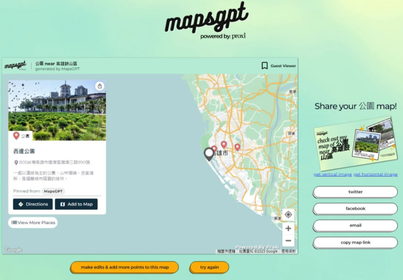 首頁線上工具生活資訊 MapsGPT 在地圖上使用 OpenAI 找出關鍵字內的相關地點 ChatGPT 對話機器人持續火爆,不但可寫文章、寫 Mail、算數學、回答各種問題,還能指定程式語言寫出程式碼、而與其相關的各種應用像是可用在搜尋引擎的ChatGPT for Google、將 ChatGPT 回答儲存成文字檔的 Save ChatGPT 瀏覽器擴充功能也相繼推出,相較於文字型的機器人,MapsGPT 則是使用 OpenAI 技術在電子地圖上協助使用者。MapsGPT 是個可用關鍵字幫使用者找出電子地圖內相關地點的免費服務,其使用條件式問句,例如找餐廳、酒店、美食、公園...,在什麼地方搜尋,接下來就會在地圖上標出該區域內的相關地點,而標出的地點,可以協同 Google 地圖的導航功能前往。MapsGPT 不須註冊即可使用,但與 ChatGPT 同樣都有回答準確率的問題,僅可當參考,不可盡信。 🔔 不錯過任何精彩! 立即訂閱我們的 LINE 官方帳號 每次發佈新文章時,您將會第一時間收到本站文章連結通知,輕鬆掌握最新資訊! 使用 LINE 追蹤文章更新 §相關文章,還可以參閱:Apple Music 台灣新用戶優惠:6個月免費暢聽,領取方式與限制一次看!2026春節追劇清單!Netflix 2月必看攻略:燒腦推理、火爆動作片,陪你從初一爽追到開工!459 萬人搶 60 萬份!運動幣中獎號碼公布,快查你的身分證尾數都馬一起GO!LINE GO新年優惠最高拿$800優惠券,還有一個月乘車金等你抽過年搭高鐵自由座要排多久?看LINE就知道 台灣高鐵×LINE TODAY推出春節限定燈號預估服務 如何使用 Proxi MapsGPT 建立互動式地圖? 1.進入 Proxi MapsGPT 網站,就會出現對話框。 2.我們們可以在 Find me 輸入像是公園、餐廳、加油站...等關鍵字,在 near 處輸入要搜尋的地點,例如高雄鼓山區、台北信義區....等,接下來輸入電子郵件信箱後,按[ Build My Map ]按鈕,當地圖建構完成後,就會以郵件通知。 3.當然,也可以直接在線上預覽,只是要稍微等候,而建構出的地圖,我們可以點擊地圖上的旗標即可顯示說明,點擊說明下的[ Directions ]按鈕,就可直接開啟 Google 地圖。 Proxi MapsGPT網站網址:https://mapsgpt.com/