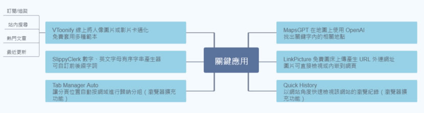 首頁瀏覽器擴充功能生產力工具 MindPane 將任何網頁快速轉換為思維導圖(瀏覽器擴充功能) 心智圖(mind map)或稱腦力激盪圖、思維導圖或概念地圖,該圖用一個中央關鍵詞或想法以輻射線連接所有的代表字詞、想法、任務或其它關聯項目,是將大量資訊結構化的一種技術,不論用在創新、學習、解決問題都適合,而當我們接觸一個有大量訊息的網頁時又該如何將其整理成思維導圖,快速了解該網頁所提供的資訊。MindPane 是一個可將任何網頁轉換成思維導圖的瀏覽器擴充功能,使用方式很簡單,只要在所在網頁使用 MindPane,就可以立刻將該網頁轉換成思維導圖,並有 8種圖形可選,最終還可以匯出 PNG圖檔保存,且不僅 Chrome 可用, Edge 也可以安裝使用,對想快速整理網站所提供資訊的用戶相當好用。 🔔 不錯過任何精彩! 立即訂閱我們的 LINE 官方帳號 每次發佈新文章時,您將會第一時間收到本站文章連結通知,輕鬆掌握最新資訊! 使用 LINE 追蹤文章更新 §相關文章,還可以參閱:Bing Chat sidebar for Chrome 讓 Chrome 在側邊欄就能使用 Bing Chat(瀏覽器擴充功能)如何在 Chrome 瀏覽器也能使用全新的 Bing AI?「UseChatGPT.AI」快速編寫、改寫、總結、解釋或翻譯網站上的任何文章 (瀏覽器擴充功能)WebChatGPT 結合網路搜尋資料,讓 ChatGPT 整合資訊沒有時間限制(瀏覽器擴充功能)ChatGPT Prompt Genius 將 ChatGPT 對話內容完整的匯出成 PNG、PDF、MD 檔或分享網址(瀏覽器擴充功能) 如何使用 MindPane 瀏覽器擴充功能,將任何網頁快速轉換為思維導圖? 1.MindPane 瀏覽器擴充功能,不僅 Chrome 可安裝, Edge 瀏覽器亦可以到 chrome 線上應用程式商店安裝使用。 2.按[ 加到 Chrome ]按鈕後,按指引即可安裝,完成後會出現 MindPane 的圖示按鈕。 3.使用需在當前網頁按 MindPane 的圖示按鈕,就會生成該網頁的思維導圖,MindPane 提供 8種圖形可供選擇。 4.最終,我們可以將該圖轉 PNG圖檔保存。 MindPane語言:英文性質:免費官方網站:https://chrome.google.com/webstore/detail/mindpane/ioimcileegaodabmbcnadppghhakneae/related