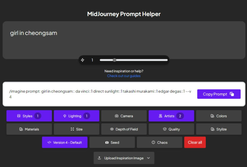 MidJourney Prompt Helper 是一個可以協助使用者將產圖文字描述額外加入燈光、相機、藝術家、顏色、材料、尺寸、景深樣式等各式特殊效果的指令網站,使用者只須輸入產圖的文字描述後,再選擇想要的圖片效果,MidJourney Prompt Helper 就會將圖片效果指令額外加入到文字描述內,再將該指令複製到 MidJourney 網站來執行即可。
