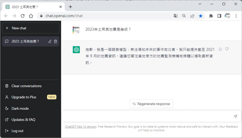 4.尚未安裝 WebChatGPT 瀏覽器擴充功能時,如果我們詢問「2023年土耳其地震是幾級?」,我們會得到「抱歉,我是一個語言模型,無法得知未來的事件或災害。我只能提供截至 2021 年 9 月的地震資訊。建議您關注當地官方的地震監測機構或媒體以獲取最新資訊。」的內容回覆。