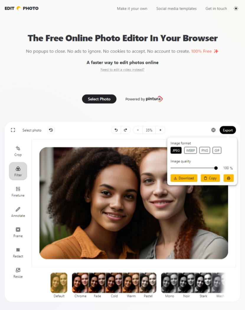 首頁線上工具影像繪圖 Edit • Photo 直接在瀏覽器中編輯圖片,具有裁剪、濾鏡、註釋、轉檔等功能 圖片編輯工具,不論是桌面應用軟體或是線上應用程式都有很多選擇,像是 Windows 內建的「小畫家」、或是GIMP,都是不錯的選擇,主要就看功能是否合用及自己會不會操作,而 Edit • Photo 則是一個免費的圖片編輯工具網站,如果功能符合,操作基本不會有問題。Edit • Photo 是一個提供使用者在瀏覽器就能編輯圖片的網站,其具備有裁剪、濾鏡、色彩調整、註釋、相框、遮罩、尺寸調整及轉檔等主要功能,各項功能在操作上也設計的相當直覺,使用 Edit • Photo 不需要註冊,沒有任何的廣告,也不會要使用者接受有被跟蹤風險的 Cookie,下載的成品亦不會有浮水印,完全免費。 🔔 不錯過任何精彩! 立即訂閱我們的 LINE 官方帳號 每次發佈新文章時,您將會第一時間收到本站文章連結通知,輕鬆掌握最新資訊! 使用 LINE 追蹤文章更新 §相關文章,還可以參閱:跟著做就會!教你用 ChatGPT 製作具職業形象的漫畫風頭像Put!所見即所得的 AI 提示詞圖庫:讓你看著範例圖,複製就能做出同級作品Google 親自示範:Nano Banana AI 圖像編輯工具的 13 個熱門玩法照片角度不滿意?AI 幫你調整!3D Camera Control 讓舊照片任意變換視角Meta AI 免費帳戶也能用 Midjourney!無限生成 AI 圖片,台灣可用 如何在瀏覽器中使用 Edit • Photo 網站編輯圖片? 1.進入 Edit • Photo 網站,點選[ Select Photo ]按鈕來選擇要編輯的圖片。 2.載入要編輯的圖片後,在其左側就會看到工具列。 3.點選工具後,就會在圖片的上方或下方出現可操作的功能,例如 Crop 工具,我們可以在圖片上方看到旋轉、翻轉、尺寸比例、而在下方就可以根據所選進行調整。 4.Filter 則提供範本套用。 5.Annotate 則提供圖片註釋等功能。 6.Redact 則提供馬賽克功能。 7.最後,右上方的[ Export ]按鈕,可以讓我們下載成不同的圖片檔案格式。 Edit • Photo網站網址:https://edit.photo/
