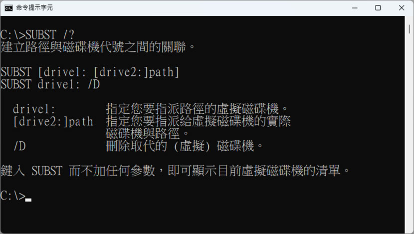 1.Subst 指令,不論是「命令提示字元」或「Windows PowerShell」都適用,先來看看用法。