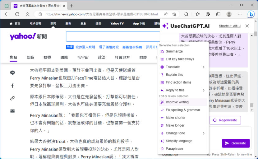 以往我們寫文章、做報告常會到網路搜尋相關資料,讓自己消化後才動手寫出,如今,只要將文章或報告的相關主題詢問 ChatGPT 人工智慧聊天機器人,從搜尋到總結就能一手包辦,加快文章或報告的產出,換句話說,人機協作、AI 輔助的此類學習或生產模式已然成形,而 「UseChatGPT.AI」這個跟 Bing AI Copilot 功能相似且同樣採 GPT-4 模型的瀏覽器擴充功能更是將常用的文章編寫、翻譯等功能具體化。
