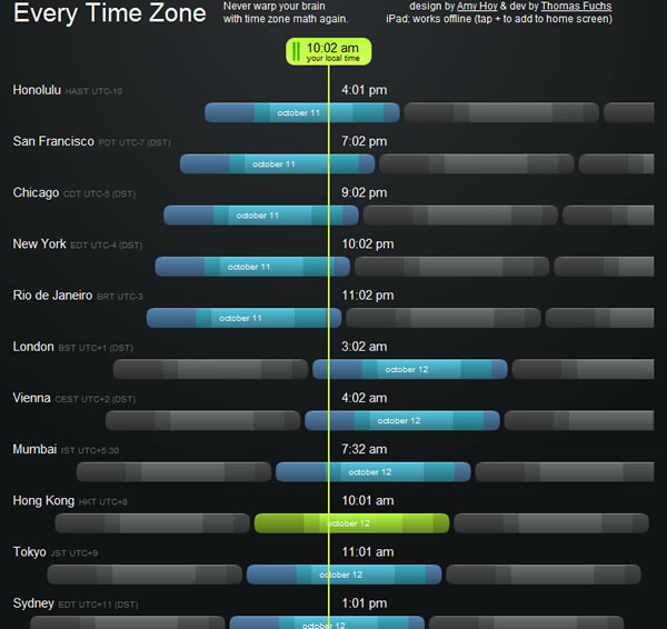 首頁線上工具網頁瀏覽 Every Time Zone 同時顯示不同時區的時間 若有親朋好友遠在國外或自身遠在國外,想撥個電話問候下時,這時候,若是在不同的時區裡,就可能需要考慮對方目前的時間,明明是好意,卻有可能是在大半夜的時候,叫人家起床,那可就不太好了。Every Time Zone 是一個可線上顯示不同時區的時間,透過其時間拉感的設計,方便推算出各個時區目前的時間。 🔔 不錯過任何精彩! 立即訂閱我們的 LINE 官方帳號 每次發佈新文章時,您將會第一時間收到本站文章連結通知,輕鬆掌握最新資訊! 使用 LINE 追蹤文章更新 §相關文章,還可以參閱:Chrome 推出 Auto Browse:讓 AI 自動訂機票、找房子、填表單,還能即時改圖Google 搜尋『67』會發生什麼事?網友實測驚呼:螢幕活了!Google 2025 台灣年度搜尋榜:地震、普發現金、Gemini,我們都在找什麼?ChatGPT Atlas 瀏覽器問世:三大 AI 功能顛覆你的上網方式Microsoft Rewards 點數全自動狂賺法,一鍵設定、天天進帳! 如何使用 Every Time Zone? 1.進入 Every Time Zone 網站後,在 Your local time 處會顯示目前所在地的時間,最左側為城市名稱,每個城市以三個橫條代表今天極其前後各一天。 2.使用滑鼠拖動 Your local time 的綠色按鈕,就可推算出以綠色按鈕內顯示時間為主的,不同時區裡的各個城市目前時間。 Every Time Zone網站網址:https://everytimezone.com/