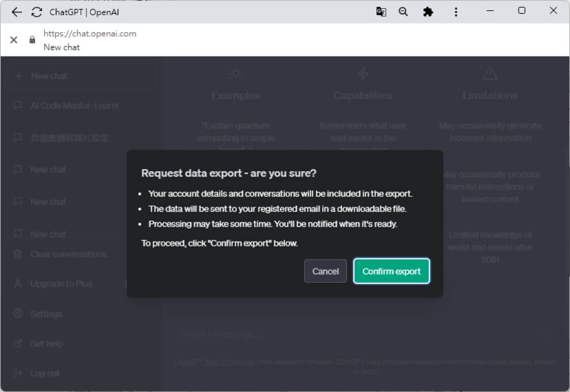 首頁線上工具生產力工具 「ChatGPT」如何匯出完整的對話內容? 想要取得與 ChatGPT 的對話內容,可以用滑鼠選取內容後複製到剪貼簿,也可以安裝像是 Save ChatGPT 或是 ChatGPT Prompt Genius 這類的瀏覽器擴充功能來輔助,但如果想要取得完整與 ChatGPT 的歷史對話內容,我們還可以使用 OpenAI 內建在 ChatGPT 內的 Export data 原廠功能,讓先前的對話內容,也可以完整的匯出成 HTML 檔案,再利用瀏覽器開啟即可,讓閱讀容易且搜尋也更加方便。 🔔 不錯過任何精彩! 立即訂閱我們的 LINE 官方帳號 每次發佈新文章時,您將會第一時間收到本站文章連結通知,輕鬆掌握最新資訊! 使用 LINE 追蹤文章更新 §相關文章,還可以參閱:OpenAI 在 ChatGPT 中測試廣告|哪些帳戶受影響、廣告運作原則一次看在蝦皮當賣家,商品如何定價?手續費、免運、稅金怎麼算?蝦皮手續費計算機幫你全搞定!Google AI Plus 降到 260 元對決 ChatGPT Go!誰的功能更值得訂閱?ChatGPT Go 月付 290 元值得嗎?免費版、Plus 完整比較用 AI 做出的電影,YouTube 就看得到!一起來欣賞這部贏得百萬美元的突尼西亞短片《Lily》 「ChatGPT」如何下載完整的對話內容? 1.進入 ChatGPT 對話頁面,可以點擊左側的[ Settings ]按鈕。 2.再接下來出現的對話頁面,可以點擊[ Export data ]按鈕。 3.對話內容中有說明,對話內容的取得是需要時間準備的,完成後會有通知郵件寄送到當初註冊的電子郵件地址,點擊[ Confirm export ]。 4.如無意外,就會出現成功訊息,接下來就是等通知的電子郵件。 5.通知信內含的檔案下載鏈結,24小時內有效。 6.檔案解壓縮後,會看到如下圖的檔案列表。 7.可使用瀏覽器開啟 chat.html,就可以看到每次的對話紀錄,如果內容很多,適時的使用瀏覽器內建的搜尋功能,將有助於快速找出對話內容。