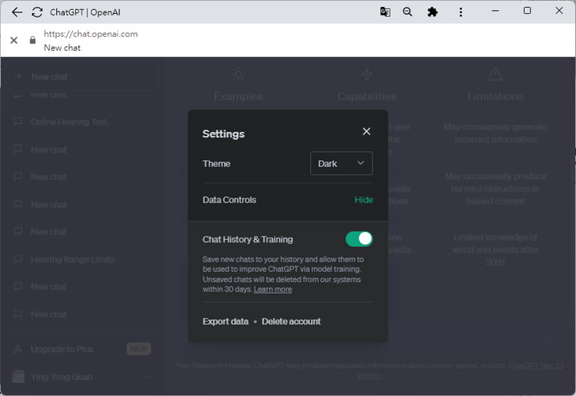 首頁線上工具資訊安全 如何關閉 ChatGPT 聊天紀錄,避免對話成為訓練資料? 如果有時常關注 ChatGPT 的相關新聞,可能已經知道義大利是第一個禁用 ChatGPT 的國家,而其禁用的原因是出於隱私問題,因為當我們與 ChatGPT 進行對話時,我們的對話內容也會被用作訓練 ChatGPT 的數據。為此,Open AI 在 ChatGPT 中增加了一項資料控制功能,該功能除了可讓使用者匯出自己與 ChatGPT 的完整對話紀錄外,還可以讓使用者自行選擇是否關閉聊天記錄和模型訓練功能,資料控制功能啟用後,新的對話內容將不會被用於訓練和改進 ChatGPT 模型,且也不會出現在歷史記錄側邊欄中,但為了監控濫用情況,ChatGPT 會保留所有對話內容 30 天,然後再永久刪除。 🔔 不錯過任何精彩! 立即訂閱我們的 LINE 官方帳號 每次發佈新文章時,您將會第一時間收到本站文章連結通知,輕鬆掌握最新資訊! 使用 LINE 追蹤文章更新 §相關文章,還可以參閱:終結網路霸凌!Google 搜尋新工具幫你永久移除私密影像注意!Let's Encrypt 憑證期限從 90 天減半至 45 天,因應方法看這裡朱雀大模型檢測:騰訊推出的 AI 內容鑑別工具,精準識別 AI 生成文章與圖片如何透過「Google One」檢查 Gmail 是否因資料侵害事件外洩到暗網上?Batch PDF Encryptor 替 PDF 檔案加入擁有者與開啟密碼保全措施 免費可批量 如何關閉 ChatGPT 聊天紀錄,避免對話成為訓練資料? 1.要利用 ChatGPT 內建功能匯出完整地對話紀錄,可參閱:「ChatGPT」如何匯出完整的對話內容?,另外,資料控制也同樣也是在[ Settings ]處控制,點擊使用者名稱,便可看到。 2.在出現的對話頁面,點擊[ show ]。 3.要匯出及開關對話紀錄均在此處操作。 4.要關閉前,建議你可以點擊 Learn more 閱讀 Data Controls FAQ 相關說明,原則上就是資料控制功能關閉後,新的對話內容將不會被用於訓練和改進 ChatGPT 模型,且也不會出現在歷史記錄側邊欄中,但為了監控濫用情況,ChatGPT 會保留所有對話內容 30 天,然後再永久刪除。