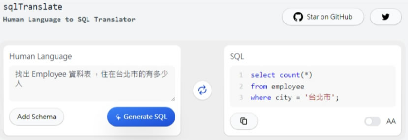 1.進入 SQL Translator 網站,在 Human Language 欄位中輸入文字描述,例如:找出 Employee 資料表 ,住在台北市的有多少人。