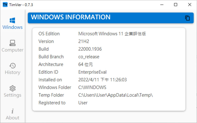 首頁電腦軟體系統應用 TimVer 一站式顯示 Windows 版本及電腦硬體相關訊息的工具 安裝完 Windows 後,我們可以透過「設定 > 系統資訊」獲得裝置和 Windows 的相關規格。然而,我們可能會發現某些資訊似乎不完整,例如作業系統安裝時間、硬碟安裝位置和 CPU 核心數。在 Windows 中,這些資訊可能需要在不同的查詢中尋找。然而,透過免費的工具軟體 TimVer,我們可以輕鬆地將常用的資訊集中在一個介面中顯示,省去了分散查詢帶來的不便之處。 🔔 不錯過任何精彩! 立即訂閱我們的 LINE 官方帳號 每次發佈新文章時,您將會第一時間收到本站文章連結通知,輕鬆掌握最新資訊! 使用 LINE 追蹤文章更新 §相關文章,還可以參閱:CatLock:可鎖定鍵盤的 Windows 應用程式,防止寵物意外觸碰Zen Ad blocker 瀏覽器與應用程式均適用的廣告攔截器,免費且開放原始碼「微軟電腦管家」內含開機啟動項目管理、儲存空間最佳化等免費工具 全方位提升電腦效能Windows Startup Timer 測量 Windows 從開機到完全啟動所需時間ElevenClock 讓 Windows 11 工作列的時間可以顯示秒數 如何使用 TimVer 軟體,顯示電腦軟硬體資訊? 1.完成安裝後,開啟 TimVer 應用程式,預設就會顯示 Windows 相關資訊,其中包含 Windows 版本、安裝時間即起安裝路徑等。 2.透過左側欄,可以切換顯示硬體資訊。 3.如果想要將這些資訊儲存成文字檔,只要按右上角的複製按鈕圖示,再貼到記事本內即可。 4.除了可用 Windows 內建的系統資訊及 TimVer 工具外,如果不排斥用指令,也可以在終端機輸入 WinVer 指令查詢。 TimVer語言:英文性質:免費官方網站:https://github.com/Timthreetwelve/TimVer