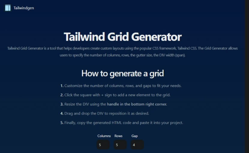 首頁線上工具開發工具 Tailwindgen 線上 Tailwind CSS 網頁佈局產生器 Tailwind 是一個用於網頁開發的 CSS 框架,它提供了一套預先定義好的 CSS 類別,這些類別可以用於快速構建和自定義網頁的外觀和排版。換句話說,使用 Tailwind CSS 框架,開發者無需從頭學習原生的 CSS 語法,而是通過使用直觀且有意義的 CSS 類別,就能夠輕鬆地調整和設置元素的樣式和排版。Tailwindgen 這個網站則是提供 Columns、Rows 及 Gaps 三個參數快速產生基礎網格後,再讓使用者依據需求使用滑鼠拖曳出想要的網頁布局,而每次調整都能即時產出預覽網格,最後可以產生 JSX 或 HTML Code,直接複製就可以貼到應用 Tailwind CSS 框架的網頁,相當方便。 🔔 不錯過任何精彩! 立即訂閱我們的 LINE 官方帳號 每次發佈新文章時,您將會第一時間收到本站文章連結通知,輕鬆掌握最新資訊! 使用 LINE 追蹤文章更新 §相關文章,還可以參閱:網站效能健檢免費工具!PageTest 多裝置模擬效能分析及由 AI 提出改進建議Regex-Vis 圖解正則表達式的線上工具,可編寫還可驗證Sitemap Generator:線上快速產生符合 SEO 標準的網站地圖,無網址數量限制適用各類型網站網站隱私權政策產生器 Privacy Policy Generator:輸入網站名稱和網址即可輕鬆生成專屬條款Frame0:輕鬆繪製應用程式流程圖、UML 和介面雛形的免費工具,適用於 macOS 與 Windows 如何使用 Tailwindgen 產生以 Tailwind CSS 框架的網頁布局? 1.進入 Tailwindgen 網站,Columns、Rows 及 Gap 預設分別是 5、5、4。 2.捲動網頁向下就可以看到預覽。 3.將設想好的網頁布局,利用參數先行調整出來,例如三欄式的布局。 4.接下透過滑鼠拖拉 DIV 開始合併,做出網頁所要的框架,並複製所需語法,即可應用。 Tailwindgen網站網址:https://www.tailwindgen.com/
