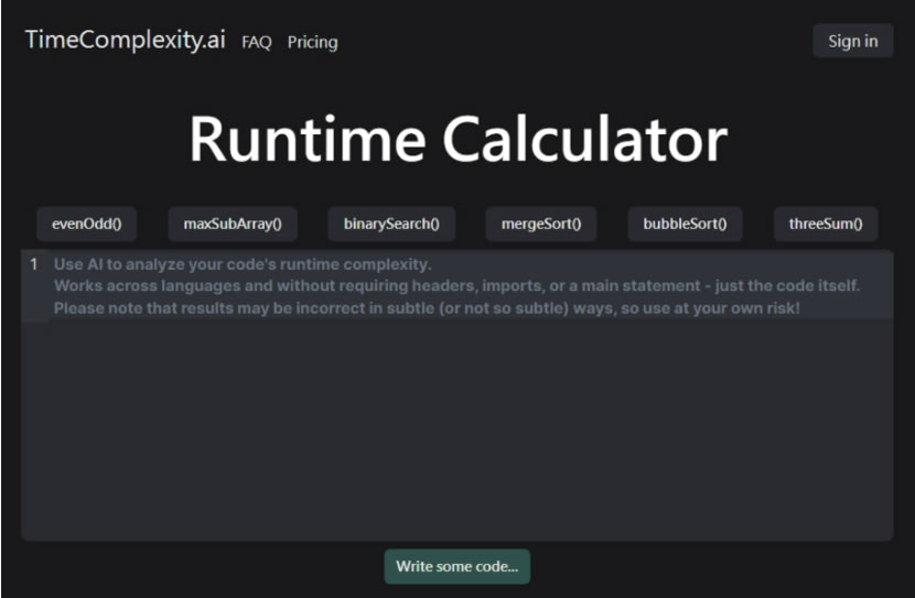 使用「TimeComplexity.ai」網站來估算程式碼的時間複雜度,未註冊用戶有每日20次的使用限制,註冊用戶為 50次,超過這些次數可以付費。