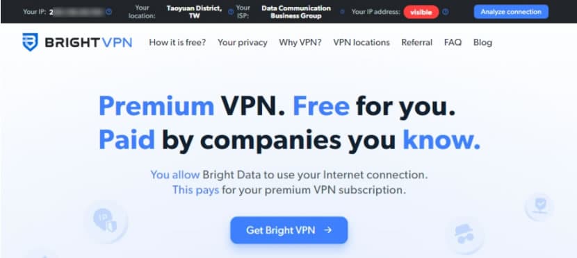 1.進入 Bright VPN 網站,左上角會顯示目前所使用的 IP 位址,點擊[ Get Bright VPN ]按鈕開始下載 Bright VPN 桌面客戶端應用程式。