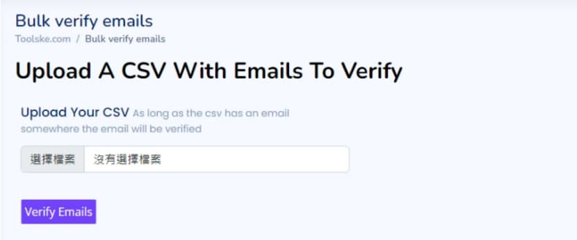 1.Bulk verify emails 電子郵件驗證工具是以 CSV 檔案為單位,所以不論有多少要驗證的電子郵件地址都可以放入 CSV 檔案內,然後上傳。