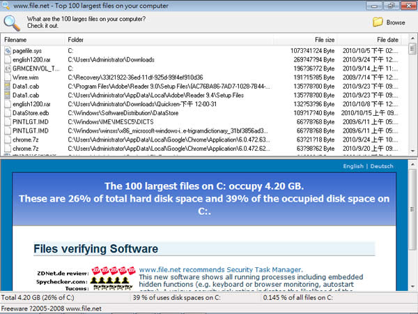 首頁電腦軟體系統應用 Largest Files Finder 找出佔用硬碟空間的前 100 大檔案 想知道硬碟裡檔案所佔用的空間分布,可以使用像是 SpaceSniffer 磁(硬)碟空間分析工具(免安裝) 、 TreeSizeFree 檢視所有磁碟及資料夾所占用的硬碟空間(免安裝) 及 Disk Space Fan 圖形化的磁碟空間分析及管理工具,若想知道佔用硬碟空間的前 100 大檔案,則可以使用 Largest Files Finder 這套免費軟體,可針對磁碟、資料夾或網路磁碟機進行搜尋且速度也不慢。 🔔 不錯過任何精彩! 立即訂閱我們的 LINE 官方帳號 每次發佈新文章時,您將會第一時間收到本站文章連結通知,輕鬆掌握最新資訊! 使用 LINE 追蹤文章更新 §相關文章,還可以參閱:CatLock:可鎖定鍵盤的 Windows 應用程式,防止寵物意外觸碰Zen Ad blocker 瀏覽器與應用程式均適用的廣告攔截器,免費且開放原始碼TimVer 一站式顯示 Windows 版本及電腦硬體相關訊息的工具「微軟電腦管家」內含開機啟動項目管理、儲存空間最佳化等免費工具 全方位提升電腦效能Windows Startup Timer 測量 Windows 從開機到完全啟動所需時間 如何使用 Largest Files Finder? 下載後,免解壓縮,免安裝,直接執行「 top100files.exe」便可開啟,預設會直接對電腦的第一個根目錄進行掃描。點擊右上方的[Browse]可變更掃描的目標。 Largest Files Finder版本:1.1.0.0語言:英文性質:免費適用:Windows官方網站:http://www.file.net/freeware/largest-files-finder.html下載:按我下載