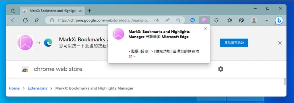 1.MarkX 不僅 Chrome 可用,Edge 瀏覽器同樣可以前往安裝,按[ Get ]按鈕,即可以依照指示進行安裝。