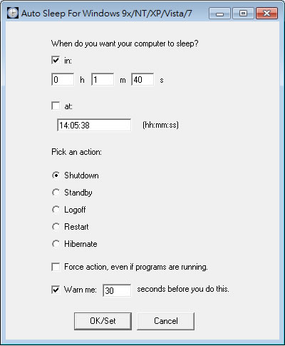 首頁電腦軟體生產力工具 Auto Sleep 可自訂時間的電腦自動關機、重新開機、休眠、待機、登出等的電腦定時器 Auto Sleep 是一套可自訂時間的電腦自動關機、重新開機、休眠及登出免費工具,可以使用倒數計時的模式,也可以自訂一個時間來執行且使用上相當簡單,若覺得應用 Windows 內建的工作排程器來設定(善用Windows 7內建的工作排程器,設定電腦定時自動關機、休眠或自動重開機!),較為複雜,可以試試 Auto Sleep。相關的軟體,可參閱Chameleon Shutdown 電腦定時自動關機、重新開機、鎖定及登出排程工具。 🔔 不錯過任何精彩! 立即訂閱我們的 LINE 官方帳號 每次發佈新文章時,您將會第一時間收到本站文章連結通知,輕鬆掌握最新資訊! 使用 LINE 追蹤文章更新 §相關文章,還可以參閱:AingDesk:一鍵安裝 Ollama AI 模型管理器,讓 LLaMA、DeepSeek 在本機電腦上運行Arc 瀏覽器正式登陸 Windows 11,開啟全新瀏覽體驗!Norton Secure Browser 使用 Chromium 核心的瀏覽器,有廣告封鎖和隱私保護功能BingGPT 桌面應用程式,讓你不用 Edge 也能用 Bing 聊天機器人SlippyClerk 數字、英文字母有序字串產生器 可自訂前後綴字詞 如何使用 Auto Sleepe? 1.下載 Auto Sleep 後進行安裝,安裝完成後,開啟 Auto Sleep 主介面,使用 in 的方式,所設定的時間會是倒數計時的模式,使用 at 的模式,是在所設定的時間執行,若想強制執行所設定的動作,可勾取 Force action, even if programs are runing.,設定好之後,點擊[OK/Set]便開始執行。 2.時間到,若有勾選 Warm me: 30 seconds before you do this.便會在執行所設定前的時間,進行提醒,若不想執行,可點擊[CancelAction]來終止。 Auto Sleep語言:英文性質:免費適用:Windows官方網站:http://toolsforwindows.site90.net/index.php?p=1_4下載:按我下載