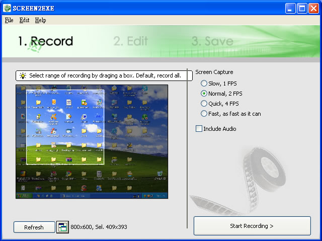 1.將檔案下載回來並安裝好軟體之後,從開始功能表執行「Screen2exe」程式,錄影作業共分3個步驟,第一個步驟可以讓我們選取要錄影的範圍,你完全不選擇的話則是錄下全螢幕的畫面,或者你可以在視窗中的縮圖用滑鼠左鍵拉出一個方框,選擇你要錄影的區塊,Screen Capture選擇你要錄影的品質,如果你要含聲音的話,請勾選[Include Audio],選好之後再按下[Start Recording]即可。