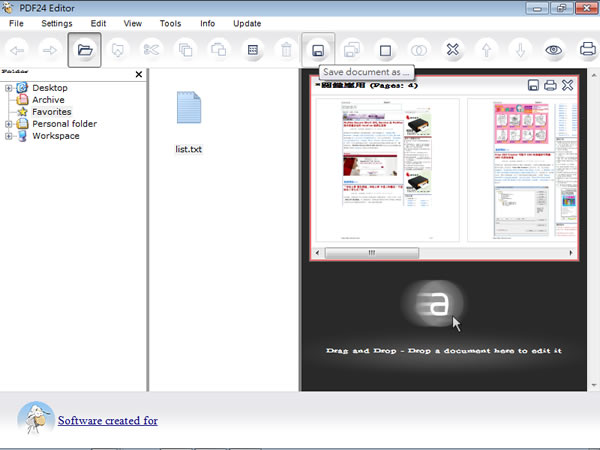 4.經過轉換後,便會開啟 PDF24 Creator 主介面,其已將網頁轉換成 PDF 檔案,點擊上方的[Save document as...]就可另存新檔。