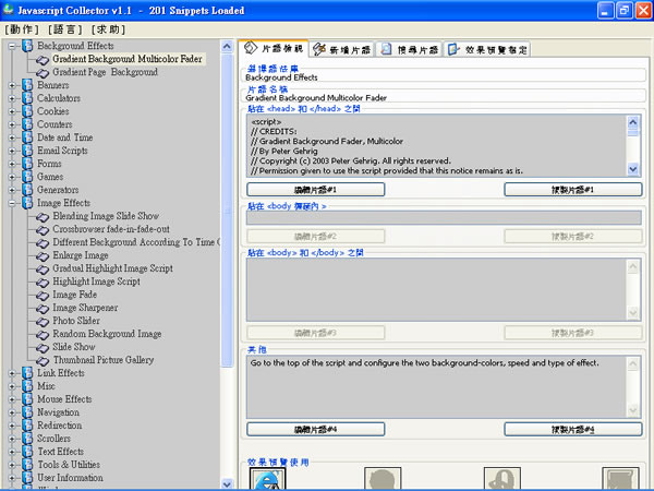 3.當我要將該段的JavaScript預覽時,只要點選左側的項目,再選擇最底部的IE圖示,就可以看到該段程式執行的效果,如果覺得滿意,就可以根據介面中語法所擺放的位置,然後複製到你的網頁