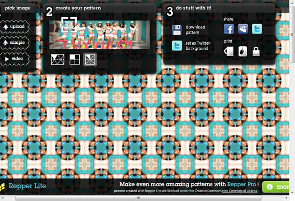 常在網路上尋找適合美工的圖片素材嗎?其實也可以自己動手做,只要透過 Repper Lite 這個網站,三個步驟就能將自己喜歡的照片(支援 JPG、GIF 及 JPEG),輕鬆製做出適合美工用的花紋素材,製作出的成品除了提供一個超連結網址,方便分享到 Facebook、Twitter 等網站,還可以免註冊、免留資料的下載回自己的電腦裡做後續的應用。