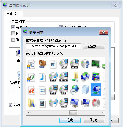 4.在出現的變更圖示設定視窗中,可以看到預設就只有資源回收桶被勾選,若想在桌面上出現其他的功能可以再行勾選其它的項目;若想變更其圖示,可在目前所出現的圖示裡點擊選擇要變更的項目後,再點擊[變更圖示],例如要變更電腦的圖示。