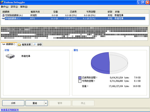 首頁電腦軟體系統應用 Defraggler 免費磁碟重組軟體(繁體中文版) Defraggler 是一個簡單好用的免費磁碟重組軟體,它跟CCleaner系統清理與Recuva檔案還原軟體都是由Piriform設計團隊所產出的,他們的首頁上有一個很顯著的標題寫著「The best software is free」,所以其發佈的軟體都是完全免費的產品,並且同時兼顧了實用、小巧、好上手等特色。而跟前面兩個超好用的系統工具一樣,Defraggler也是免費的。如果你覺得Windows內建的磁碟重組軟體速度很慢或者重組完都沒啥效果的話,可以試試看這個免費的Defraggler硬碟重組軟體。 🔔 不錯過任何精彩! 立即訂閱我們的 LINE 官方帳號 每次發佈新文章時,您將會第一時間收到本站文章連結通知,輕鬆掌握最新資訊! 使用 LINE 追蹤文章更新 §相關文章,還可以參閱:CatLock:可鎖定鍵盤的 Windows 應用程式,防止寵物意外觸碰Zen Ad blocker 瀏覽器與應用程式均適用的廣告攔截器,免費且開放原始碼TimVer 一站式顯示 Windows 版本及電腦硬體相關訊息的工具「微軟電腦管家」內含開機啟動項目管理、儲存空間最佳化等免費工具 全方位提升電腦效能Windows Startup Timer 測量 Windows 從開機到完全啟動所需時間 如何使用Defraggler? 1.開啟Defraggler主程式,在上面點選你要重組的磁碟機之後,再按下[重組]按鈕即可開始重組這個磁碟。 2.如果只要重組某個檔案或某個資料夾,可以按[動作] > [重組目錄] 或[重組檔案]來針對特定資料夾或檔案做磁碟重組。 3.重組完成後,還可在磁碟機上按右鍵按[進階設定] > [重組可用空間],針對磁碟上的可用空間做個整理。 4.此外你也可以額外做一些設定例如進行磁碟重組排程、重組完成後關機或是在重組的過程排除某些檔案...等等 Defraggler版本:2.18.945語言:英文性質:免費適用:Windows官方網站:http://www.piriform.com/defraggler下載:按我下載
