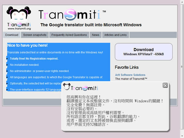 首頁電腦軟體翻譯辨識 TranSmiti 將 Google 翻譯隨時應用在 Windows 的應用程式裡(免安裝 繁體中文版) TranSmiti 是一套利用Google 翻譯引擎所製作的翻譯工具,其應用範圍不侷限在網頁上的翻譯,也可以應用在 Windows 的應用程式裡,像是 Office、文字檔或其它可被片段選取反白的文件裡,且程式免安裝,可設定是否隨開機程式來啟用,是個相當方便的翻譯工具。 🔔 不錯過任何精彩! 立即訂閱我們的 LINE 官方帳號 每次發佈新文章時,您將會第一時間收到本站文章連結通知,輕鬆掌握最新資訊! 使用 LINE 追蹤文章更新 §相關文章,還可以參閱:clawPDF 免費虛擬 PDF/Image 印表機,還有 OCR 功能DSpeech 中文也可用的文字轉語音免費軟體Balabolka 文字轉語音免費工具,可錄製成 WAV、MP3、OGG 或 WMA 聲音檔案微軟 Bing Microsoft Translator 協助你做出更好的語言翻譯Dictionary .NET 免費翻譯軟體下載(免安裝 繁體中文版) 如何使用 TranSmiti ? 1.下載 TranSmiti 後,滑鼠雙擊「TranSmiti.exe」開啟 TranSmiti 設定介面,切換到[設置]頁籤,預設的翻譯者為自動,翻譯成簡體中文,可點擊其方框中的上下箭頭來調整(意即將什麼語言翻譯成什麼語言),在快捷鍵的設定預設是使用[Windows]鍵,可點擊來更改設定,若需要 TranSmiti 隨開機程是啟用,可勾選[與Windows自動啟用]。 2.在不更改預設的快捷鍵時,若需要翻譯,只需將要翻譯的文字片段選取反白,按下[Windows]鍵,即可進行翻譯。 TranSmiti版本:1.73語言:繁體中文(多國語言)性質:免費適用:Windows官方網站:http://www.transmiti.org/en/index.html下載: 按我下載 備用下載點