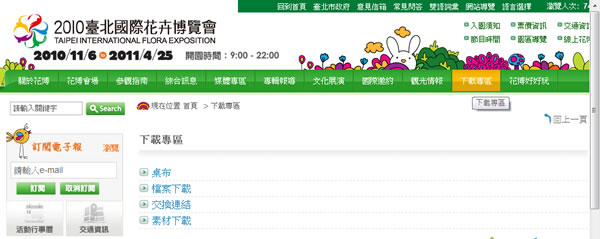 首頁線上工具生活資訊 2010臺北國際花卉博覽會 - 電腦桌布及吉祥物下載 「2010臺北國際花卉博覽會」也算是台灣的一件大事了,時間從 2010.11.6 至 2011.4.25 每日的 9:00 至 22:00 展出,開幕前一天,到其網站搜尋資料,發現有吉祥物的圖片及電腦桌布可供下載,喜愛花卉的朋友可不要錯過。 🔔 不錯過任何精彩! 立即訂閱我們的 LINE 官方帳號 每次發佈新文章時,您將會第一時間收到本站文章連結通知,輕鬆掌握最新資訊! 使用 LINE 追蹤文章更新 §相關文章,還可以參閱:BLACKPINK 寫下 YouTube 新歷史:全球首個突破 1 億訂閱的音樂藝人頻道Apple Music 台灣新用戶優惠:6個月免費暢聽,領取方式與限制一次看!2026春節追劇清單!Netflix 2月必看攻略:燒腦推理、火爆動作片,陪你從初一爽追到開工!459 萬人搶 60 萬份!運動幣中獎號碼公布,快查你的身分證尾數都馬一起GO!LINE GO新年優惠最高拿$800優惠券,還有一個月乘車金等你抽 如何下載2010臺北國際花卉博覽會 - 電腦桌布及吉祥物? 1.進入網站後,切換到下載專區,便可看到[桌布]及[素材下載] >[吉祥物下載]。 2.桌布下載,共有 14 種樣式的1024X768 與 1280X960 尺寸可供下載,下載後,可在預覽圖片上,設成桌面背景即可。 3.吉祥物下載,下載後解壓縮即可。 「2010臺北國際花卉博覽會」網站網址:http://beta.2010taipeiexpo.tw/MP_3.html