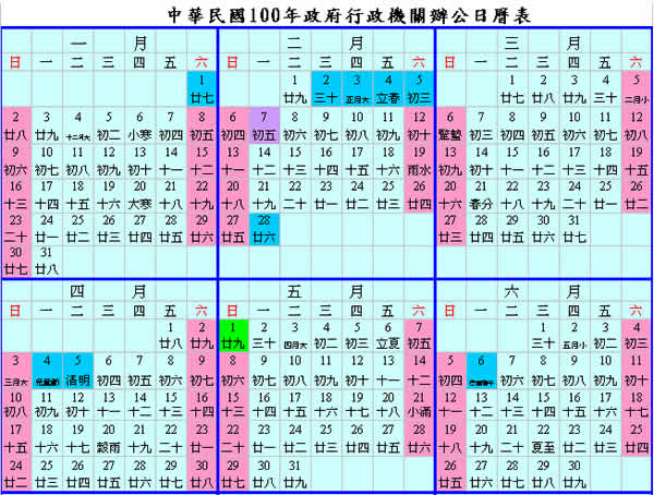 首頁電腦軟體生活資訊 行政院人事行政局 - 中華民國 100 年政府行政機關辦公日曆表下載 行政院人事行政局 - 中華民國 102 年政府行政機關辦公日曆表下載 年底將屆,若已在盤算年度的旅遊、出差等行事計畫,可參考中華民國 100 年政府行政機關辦公日曆表,來制定自身的行事曆,稍微總結除周休外的休假日如下: 2011年 1/1(六) 元旦; 2011年 2/2(三) 除夕 2/2(三) - 2/7(一) 6 天連假,若請兩天假就可變成 10 天連假; 2011年 2/28(一) 二二八和平紀念日 2/26(六) - 2/28(一), 有3 天連假; 2011年 4/4 兒童節(一)和 4/5(二) 清明節 4/2(六) - 4/5(二), 有 4 天連假; 2011年 6/6(一) 端午節 6/4 - 6/6 ,有 3 天連假; 2011年 9/12(一) 中秋節 9/10 - 9/12 ,有 3 天連假若再休 9/13 變成 4 天連假; 2011年 10/10(一) 國慶日 10/8 - 10/10 有 3 天連假。 🔔 不錯過任何精彩! 立即訂閱我們的 LINE 官方帳號 每次發佈新文章時,您將會第一時間收到本站文章連結通知,輕鬆掌握最新資訊! 使用 LINE 追蹤文章更新 §相關文章,還可以參閱:Opal 可自由混搭雨聲、風聲、交通聲...等 17種環境音播放器地牛Wake Up! - 電腦版的地震速報免安裝「姓名吉凶分析」輸入姓名就幫你分析吉凶Complete Anatomy 使用 3D 了解人類身體結構樂透選號機 - 大樂透、樂透彩、今彩 539、樂線 9宮格號碼產生器(免安裝) 行政院人事行政局 - 中華民國 100 年政府行政機關辦公日曆表下載 中華民國 100 年政府行政機關辦公日曆表下載:按此下載行政機關辦公日曆表Excel檔