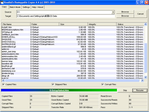 3.接著選擇Copy頁籤,填入欲修復的來源光碟或硬碟上的資料夾Source,並把修復完成的檔案,想放到那個資料夾選好Target,您可以按右方的[Browse]去選擇光碟及資料夾。就緒後再按下[Copy], Roadkil's Unstoppable Copier就開始工作了。