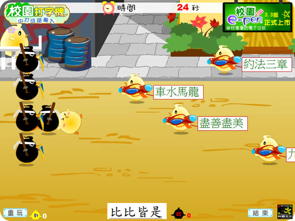 首頁教育學習國語文 「成語打字戰鬥機」 練習中文打字好幫手(單機免安裝版) 「成語打字戰鬥機」是一套可以免費使用,無功能限制的中文打字練習軟體,不同其他的中打練習軟體是以文章當作打字的範本,「成語打字戰鬥機」是以隨機出現的成語語句當作範本,除了練習中打外,還可以用來熟悉成語。 🔔 不錯過任何精彩! 立即訂閱我們的 LINE 官方帳號 每次發佈新文章時,您將會第一時間收到本站文章連結通知,輕鬆掌握最新資訊! 使用 LINE 追蹤文章更新 §相關文章,還可以參閱:AI太炎:免費古漢語大語言模型,支援釋義、翻譯、標點與識典功能「新式九宮格作業簿」可線上自編國字練習的格子簿產生器「花蓮縣字音字形學習網」一個陪伴孩子成長、學習的最佳網站教育部線上「生字練習簿」系統,自己就可建立生字練習題,還可以加入注音空格國民中小學學生簿本(國語作業簿及作文簿)免費下載 如何使用「成語打字戰鬥機」? 1.下載 「成語打字戰鬥機」並解壓縮後,使用滑鼠雙擊「08中打成語打字機.exe」便可開啟。 2.開啟後,點擊[開始]進入練習時間設定。 3.輸入要練習的時間後,點擊[下一步]。 4.中英文鍵盤切換說明,切換後,點擊[開始]。 5.進入練習。 「成語打字戰鬥機」語言:繁體中文性質:免費適用:Windows官方網站:http://www.eduweb.com.tw/下載:按我下載