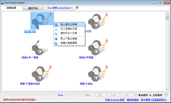 首頁電腦軟體上傳下載 Yam Music Instant 實用的蕃薯藤 Yam 天空部落影音專用下載器 Yam Music Instant [Yami] 是一套專用於「蕃薯藤 Yam 天空部落影音」網站內的即時搜尋、線上播放及下載音樂的免費軟體,操作簡單,搜尋快速且精準,可將搜尋結果列為播放清單,隨時線上收聽,也可下載回自己的電腦,喜愛 Yam 影音的朋友可不要錯過。 🔔 不錯過任何精彩! 立即訂閱我們的 LINE 官方帳號 每次發佈新文章時,您將會第一時間收到本站文章連結通知,輕鬆掌握最新資訊! 使用 LINE 追蹤文章更新 §相關文章,還可以參閱:ArrowDL 全平台下載利器:輕鬆批量下載 YouTube、BT、FB與多站串流影片YouTubePlaylistDownloader 支援播放清單與頻道的 YouTube 影片下載工具,還能轉換格式Parabolic 讓 yt-dlp 更好用的免費影音下載工具,支援上千個網站的影音下載Hasleo Windows ISO Downloader 幫你從微軟網站下載原版 Windows ISO 檔XMusicDownloader 從音樂網站搜尋並下載歌曲的免費應用程式 如何使用Yam Music Instant[Yami]? 1.下載解壓縮後,滑鼠雙擊「Yami.exe」便可開啟,開啟後,在其搜尋框輸入搜尋的關鍵字,便會及時列出結果。 2.滑鼠右鍵點擊要操作的歌曲,便會列出可操作功能表,可以加入播放列表或線上播放,也可直接下載回自己的電腦或開啟瀏覽器瀏覽該網頁,。 3.若是加入到播放清單內的音樂,可點擊[播放列表]頁籤來切換,對要播放音樂使用滑鼠雙擊後,便會開始播放,若要循環,可利用右下的[單曲循環][全部循環]來操作。 Yam Music Instant[Yami]版本:1.2.3語言:繁體中文性質:免費適用:Windows官方網站:http://www.syneart.com/下載:.NET Framework 2.0